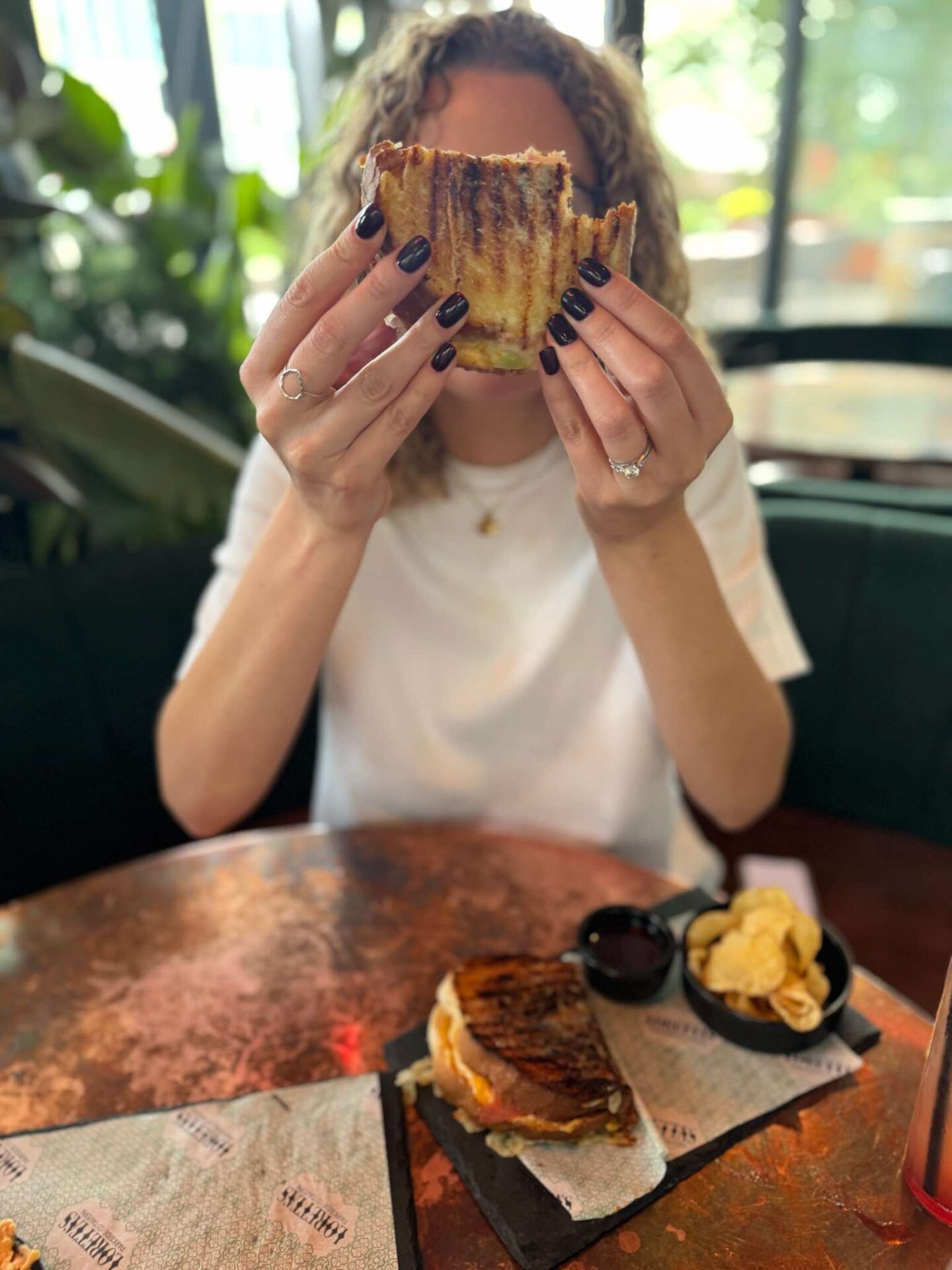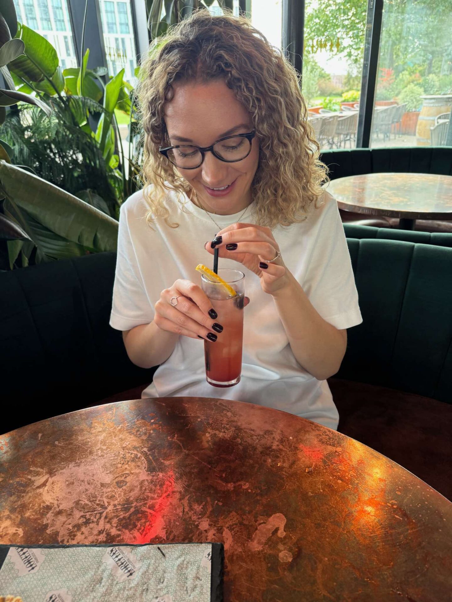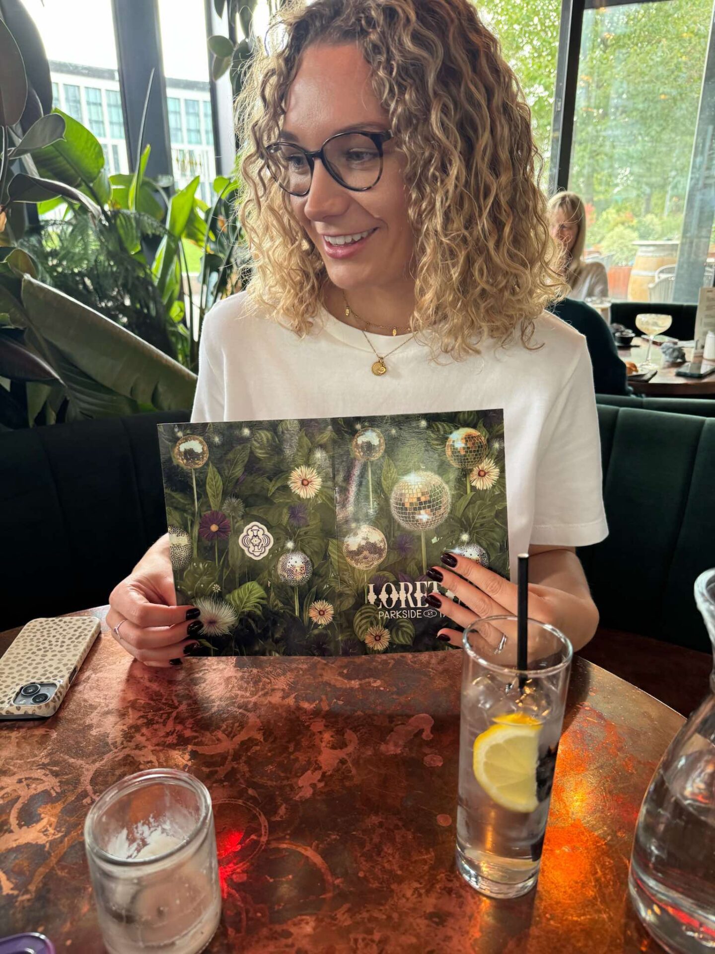 First impressions from the outside – Loretta’s is an intriguingly shaped dark wood structure with floor to ceiling glass windows, leafy plants and an outside patio with comfy seating and umbrellas. Inside, the atmosphere is warm, relaxed and a little bit glam, with trees, vines and greenery everywhere you look, blocking the outside world out, giving a botanical haven vibe and encouraging you to really relax and get in the moment.