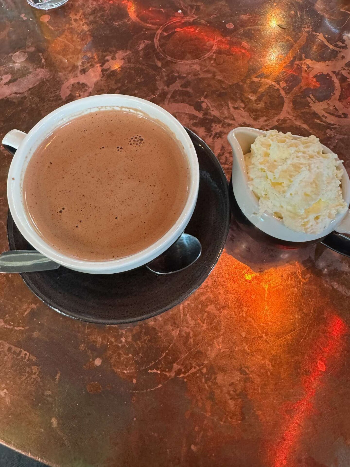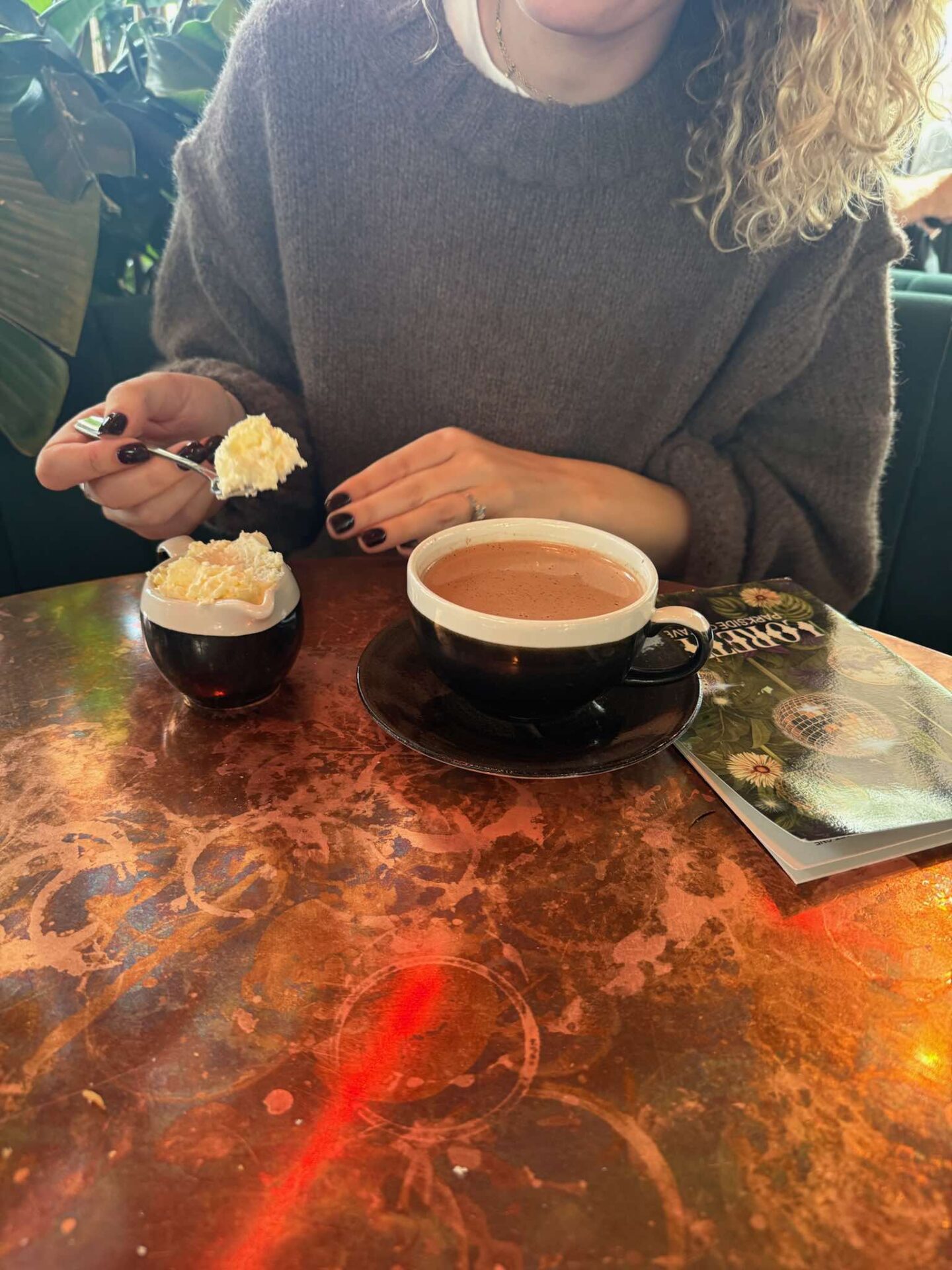 For mains, I went with the cheese and ham toastie which truly deserves a special mention. It was without doubt the best toastie I’ve ever had: soft bread, thick-cut ham, and a sprinkling of spring onions. We were absolutely stuffed by the end so our lovely waitress boxed the rest up for our son to have later on, whilst we moved onto the star of the show – Loretta’s Signature Hot Chocolate.